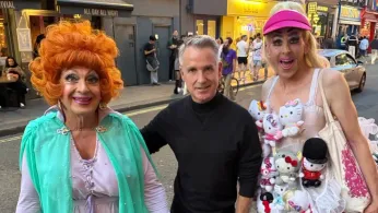 Eric and I pushed ourselves to stay awake that first day and made our way toward Rupert Street Bar to toast our London arrival. Along the walk, we stumbled onto a scene straight out of a Warner Brothers backlot: Miss Bea Haven, the beloved Palm Springs drag performer (Paul Torrigino), resplendent in full Endora-from-Bewitched regalia, chatting with my favorite London talent, Heidi Liscious (Robbie John Dean)